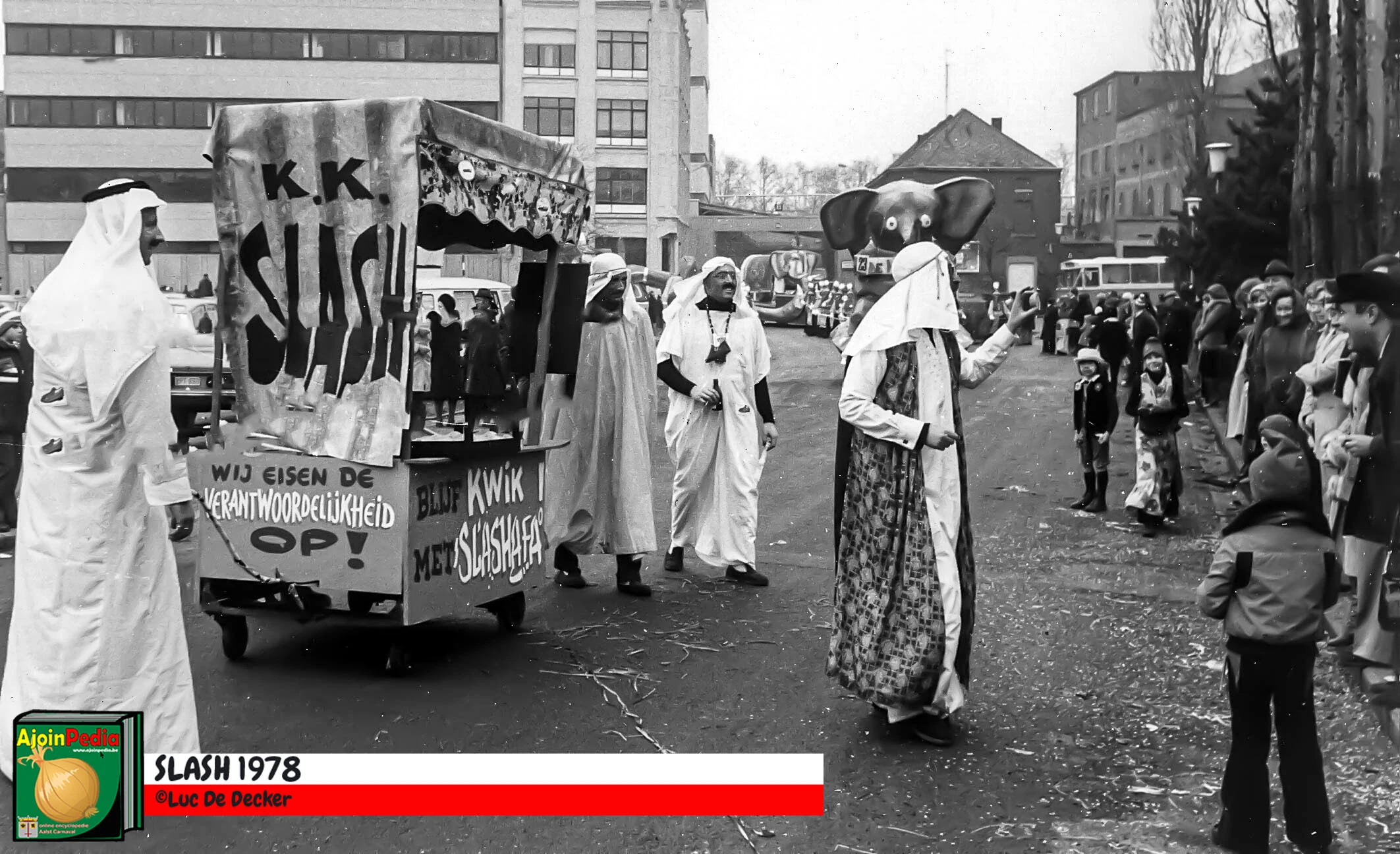 SLASH trok in 1971 van café naar café om de oude traditie van het zingen van liedjes op straat en in cafés nieuw leven in te blazen. Het volgende jaar bouwden ze voort op dit elan en brachten opnieuw liedjes. De teksten zaten vol spot en verwijten, waarbij vooral politici het moesten ontgelden. Een uitgedunde groep bracht in 1973 een parodie op The Godfather. Het jaar daarna waren er nog maar twee leden over, maar dit was ook het moment waarop ze met hun SLASH-wagentje voor het eerst deelnamen aan de stoet. Het thema "Ik zoek een eerlijk mens" gaf een duidelijke knipoog naar de politiek. De koers veranderde in 1975. SLASH combineerde cabaret en carnaval, en ze creëerden een "achtste wereldwonder" in Aalst door een gewone pint te transformeren in een speciale Pal-Ale. Het hoogtepunt kwam in 1976 tijdens de aardappelplaag, die de prijzen sterk deed stijgen. SLASH bood een ludieke oplossing door spaghetti bolognaise (Spagieters ) te serveren in plaats van aardappelen. Toen de tomatensaus opraakte, improviseerden ze met pickles en mayonaise als alternatief.