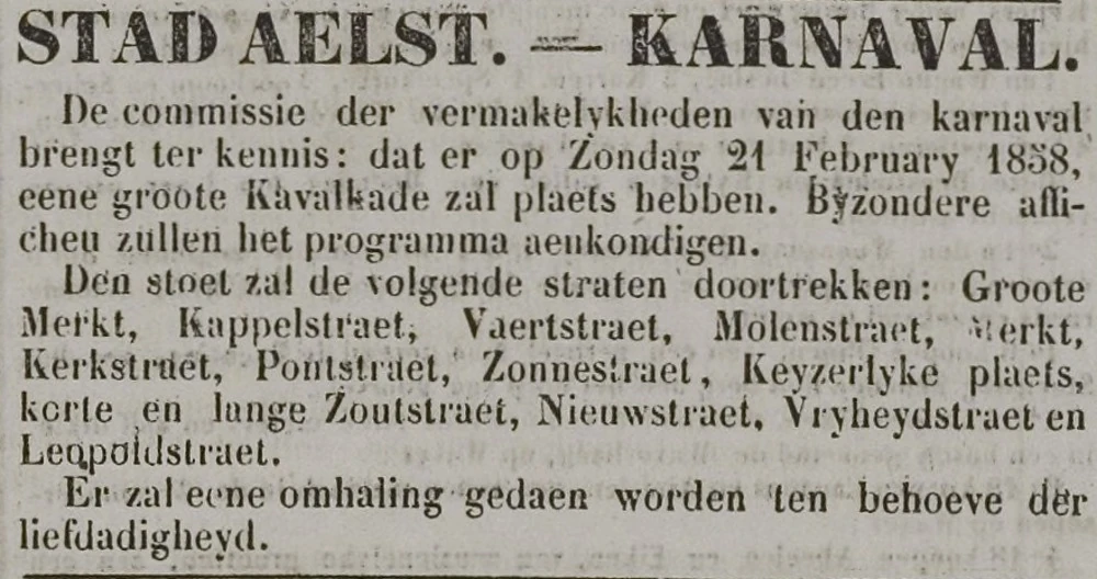 In 1858 werd in Aalst een carnavalsstoet georganiseerd op 21 februari. Hiervoor werd de commissie der vermakelykheden van den karnaval ingericht. De optocht werd aangekondigd door een affiche, die overal terug te vinden was in de stad. Tijdens de stoet werd een omhaling ten voordele van de hulpbehoevenden gedaan.